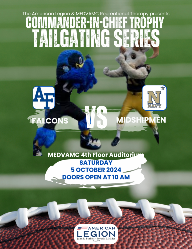 The American Legion John R. Burkett – Beverly E. Miller Post 77 is sponsoring the Commander-In-Chief Trophy Tailgating Series for our veterans at MEDVAMC.