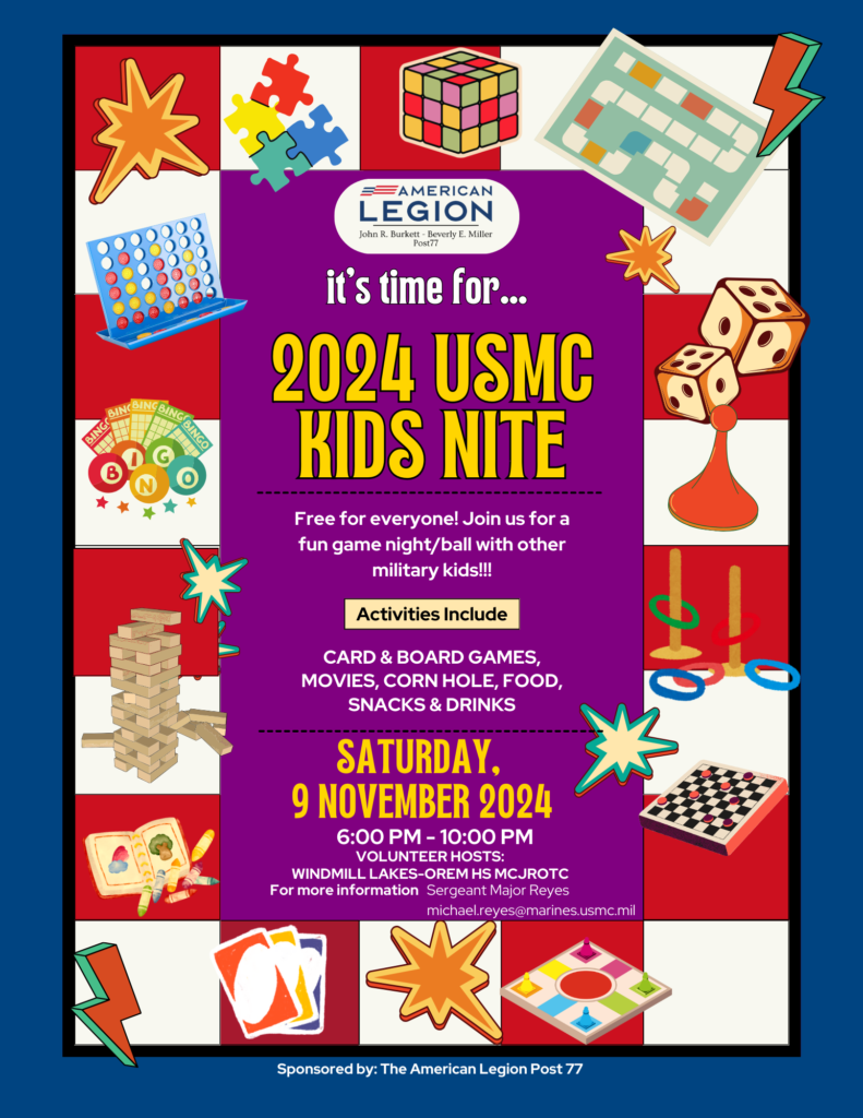 The American Legion John R. Burkett – Beverly E. Miller Post 77 in partnership with Windmill Lakes Orem HS MCJROTC are hosting the Annual USMC KIDS NITE for 8th Battalion Recruiting Station, Houston.